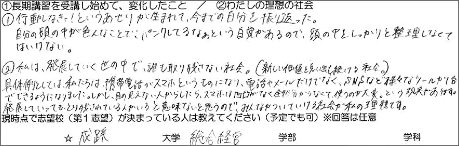 好きで得意なことをとことん伸ばし、丁寧にじっくりと学びながら、勉学と課外活動を両立した学校生活で基礎基本を徹底し、志望大学の合格を目指す。