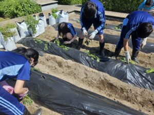 雑草抜きを行い、畝(うね)を作成し、マルチ(黒色のビニール)を被せ1本1本丁寧に作付けを行いました。