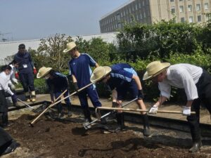 次回の活動に向けて畝をつくり、夏野菜の作付けの準備も行いました。