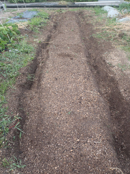 サトイモを植えるための畝(うね)つくりです。 鍬(くわ)は気をつけて使いましょう。 できあがり!先細りの畝ですが、まあまあでしょう。