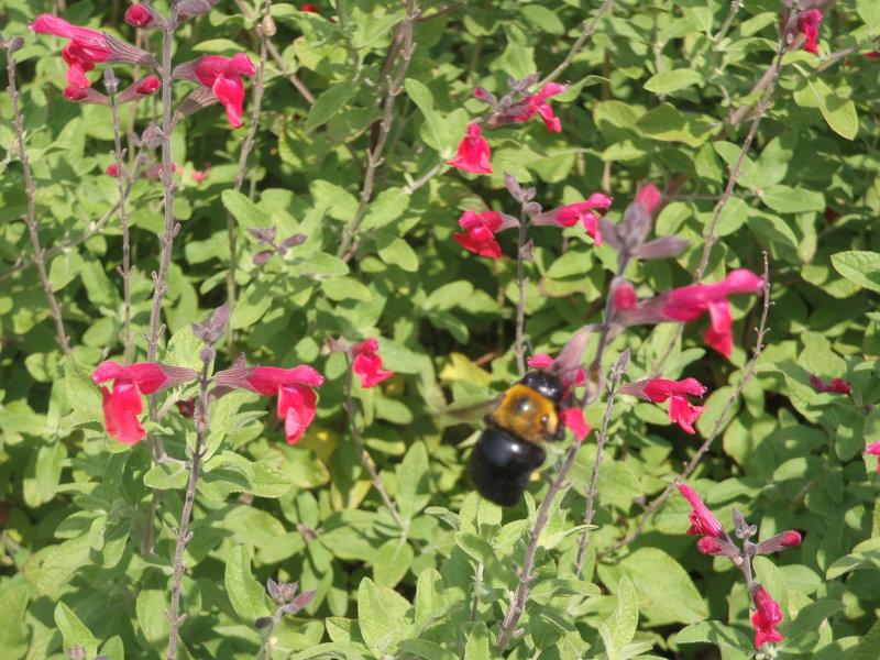 クマバチもよく見かけます。見た目は怖いですが穏やかな性質です。