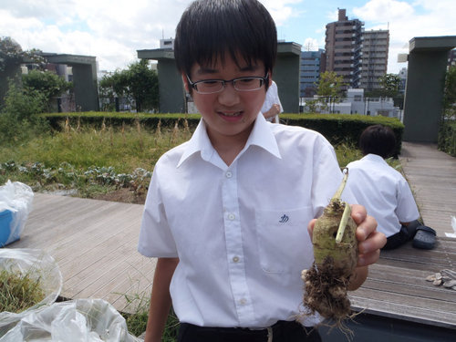 雑草を取りつつ、出来た野菜を探します。 大根?不思議な形です。間違えて抜いてしまったようです。