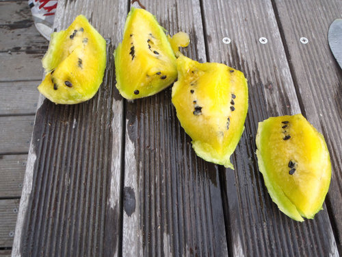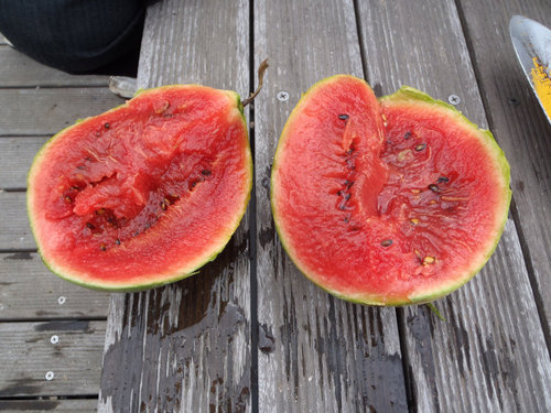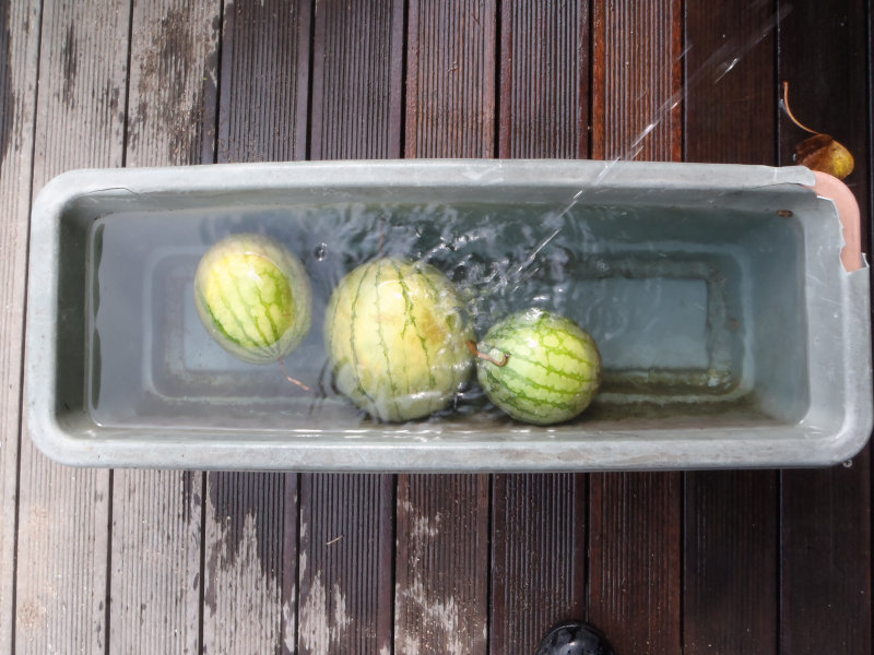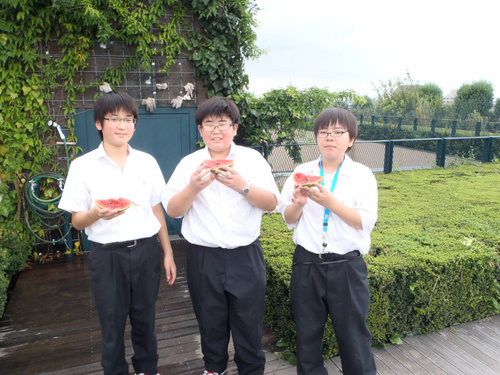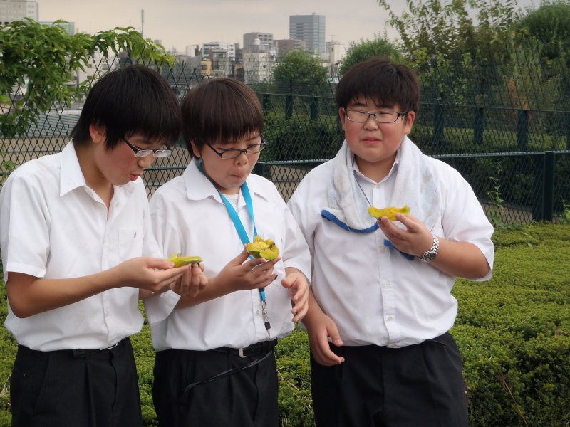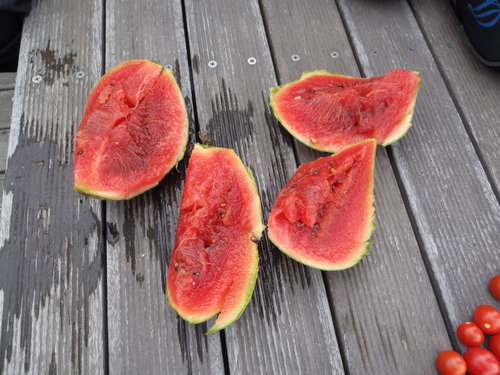 先々週のの出来事です。1学期に植えたスイカがたくさん収穫できました。 そのうち3つを食べます。 さっそく試食。