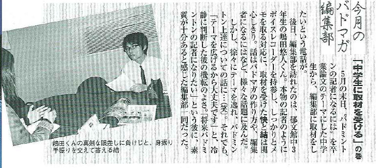 卒業論文の取材を、嶋田くんが、バドミントンマガジンにお願いをしましたところ、