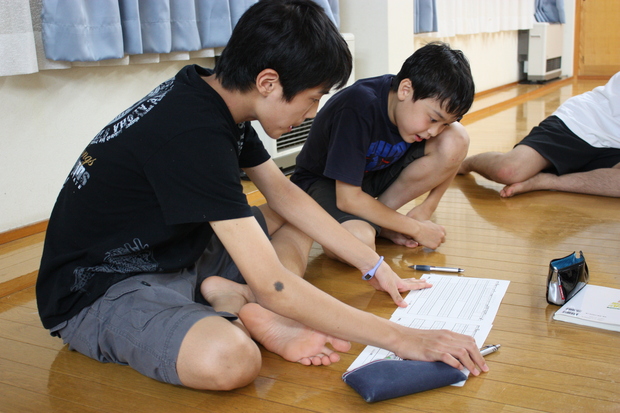 丁寧に教える、中学部長の大金くんと、うれしそうに教わっている柳澤くんです↓