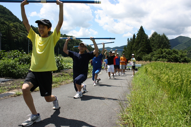 スクワットウォークは、女子も参加して行いました。男子はもちろんバド支柱を持って歩きます。