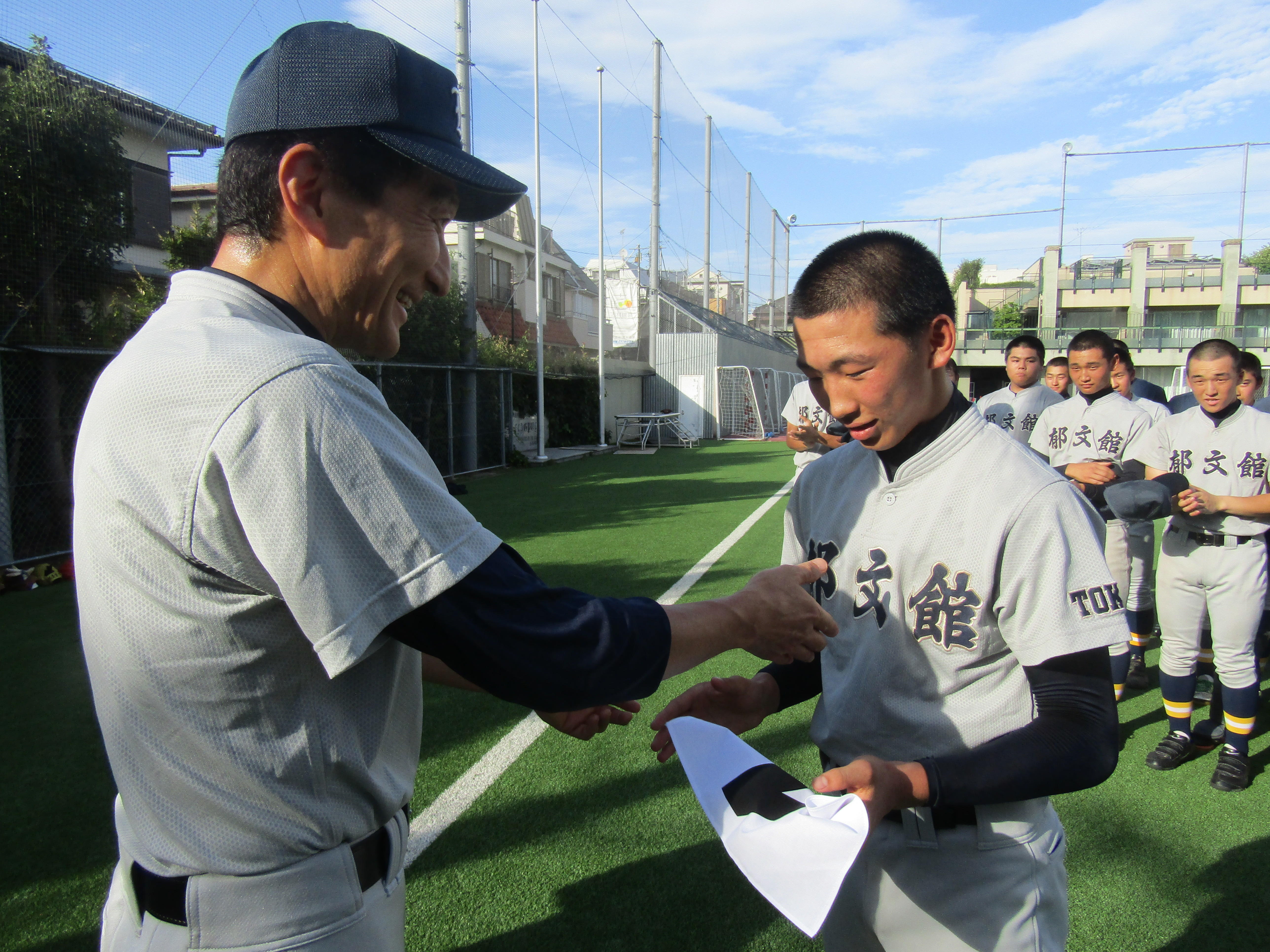 監督の高橋から番号が発表され、理事長から一人一人に背番号が手渡されます。