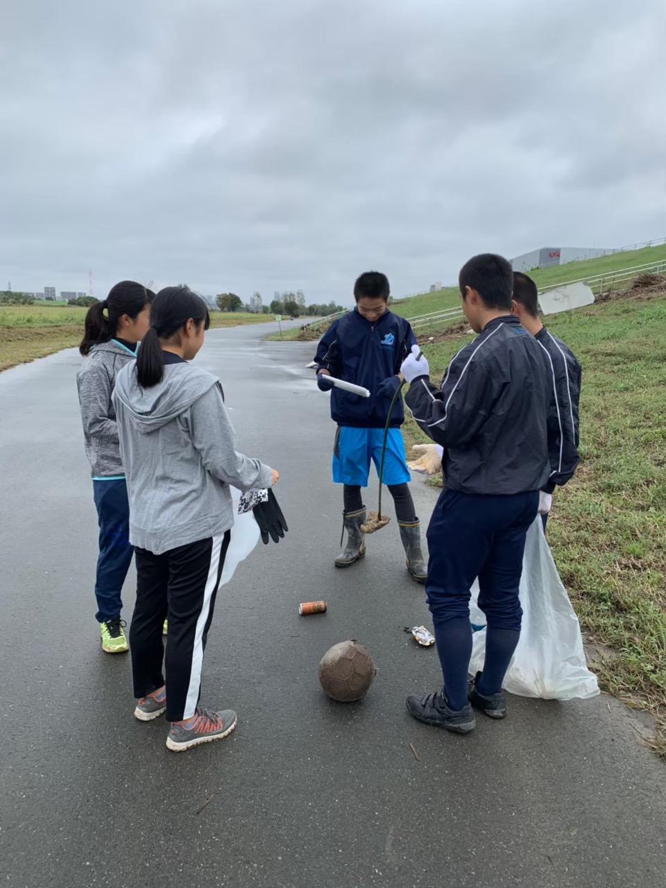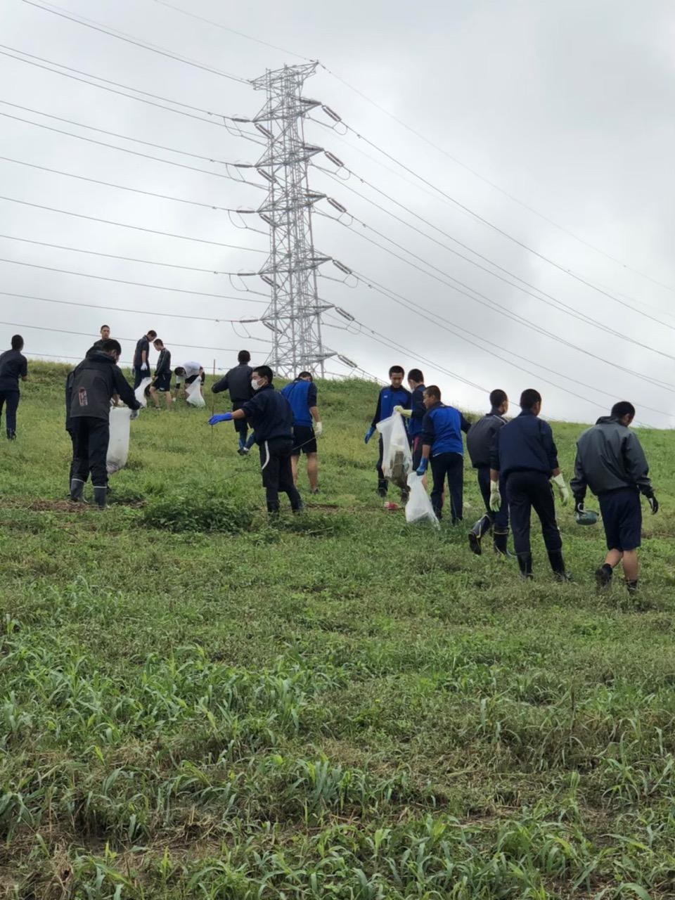 【グランド河川敷内の奉仕活動をする野球部員たち】