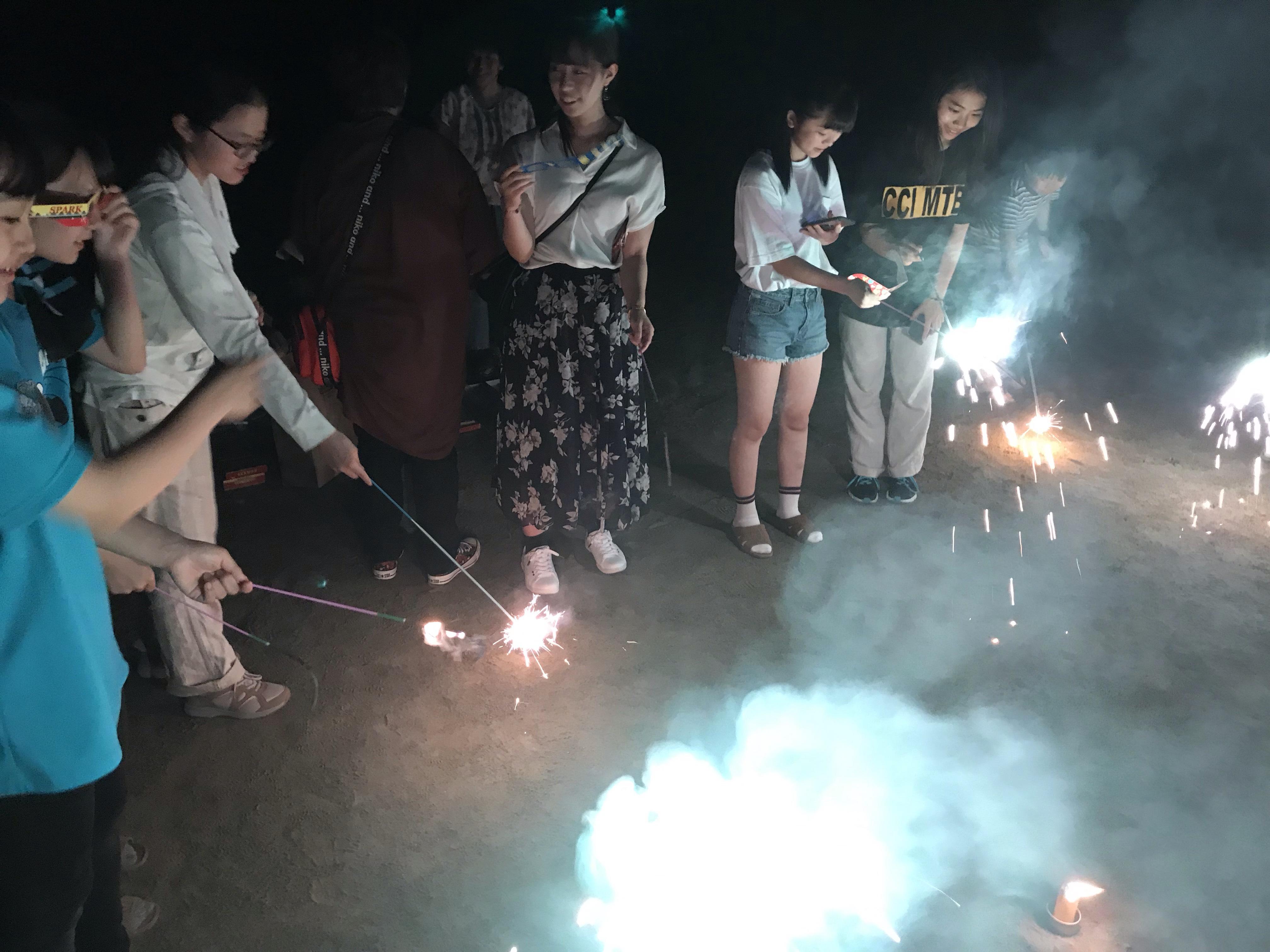 疲労の蓄積が限界にきた最終日!みんな、本当によくがんばった!!ということで最終日の夜はご褒美のBBQ!花火!肝試し!で夏の風物詩を満喫しました。きつい練習からひとまず解放ということで、部員一同(顧問も含む)全力で楽しみました。コーチの先生は花火問屋の方とお知り合いということもあり、花火も本格的です。