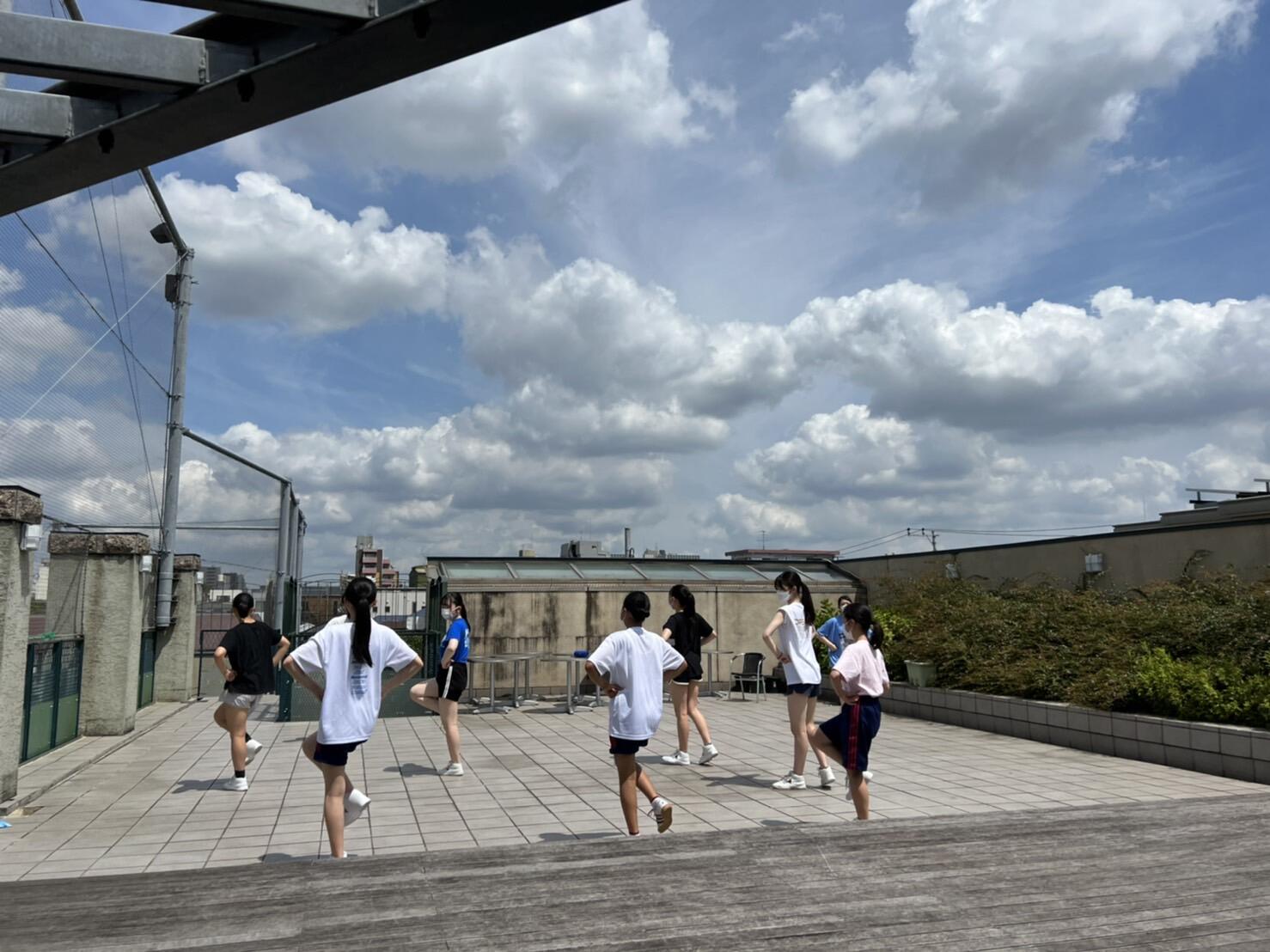 (↓熱中症対策を兼ねて本校3Fテラスでも練習しました!)