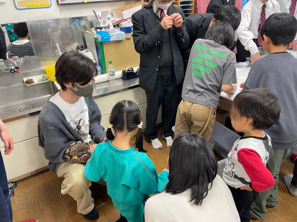 子ども達もおおいに喜んでくれたと思います。生物部員も自分たちのお気に入りの生物を「見せびらかす」ことができて喜んでいました。笑