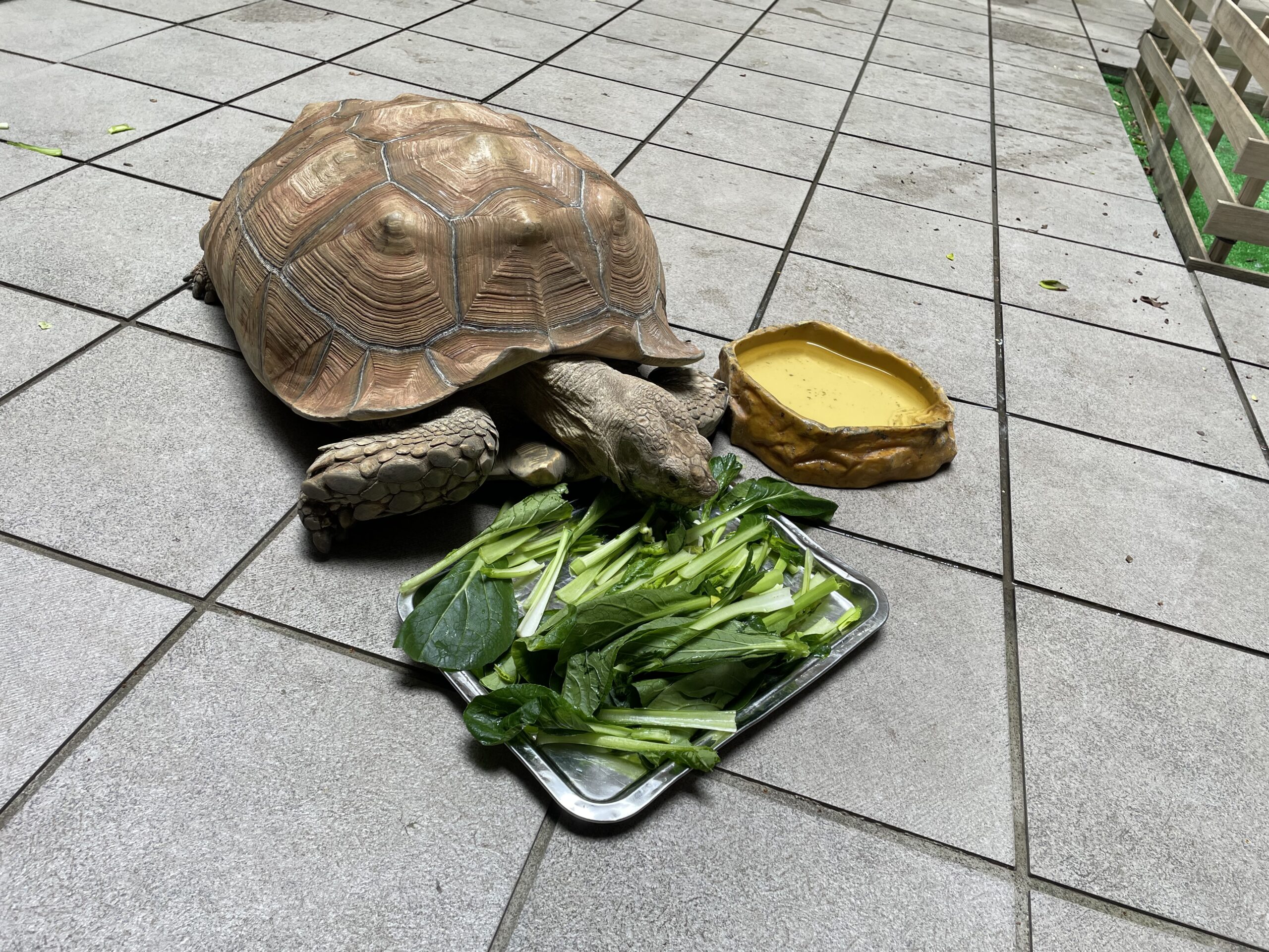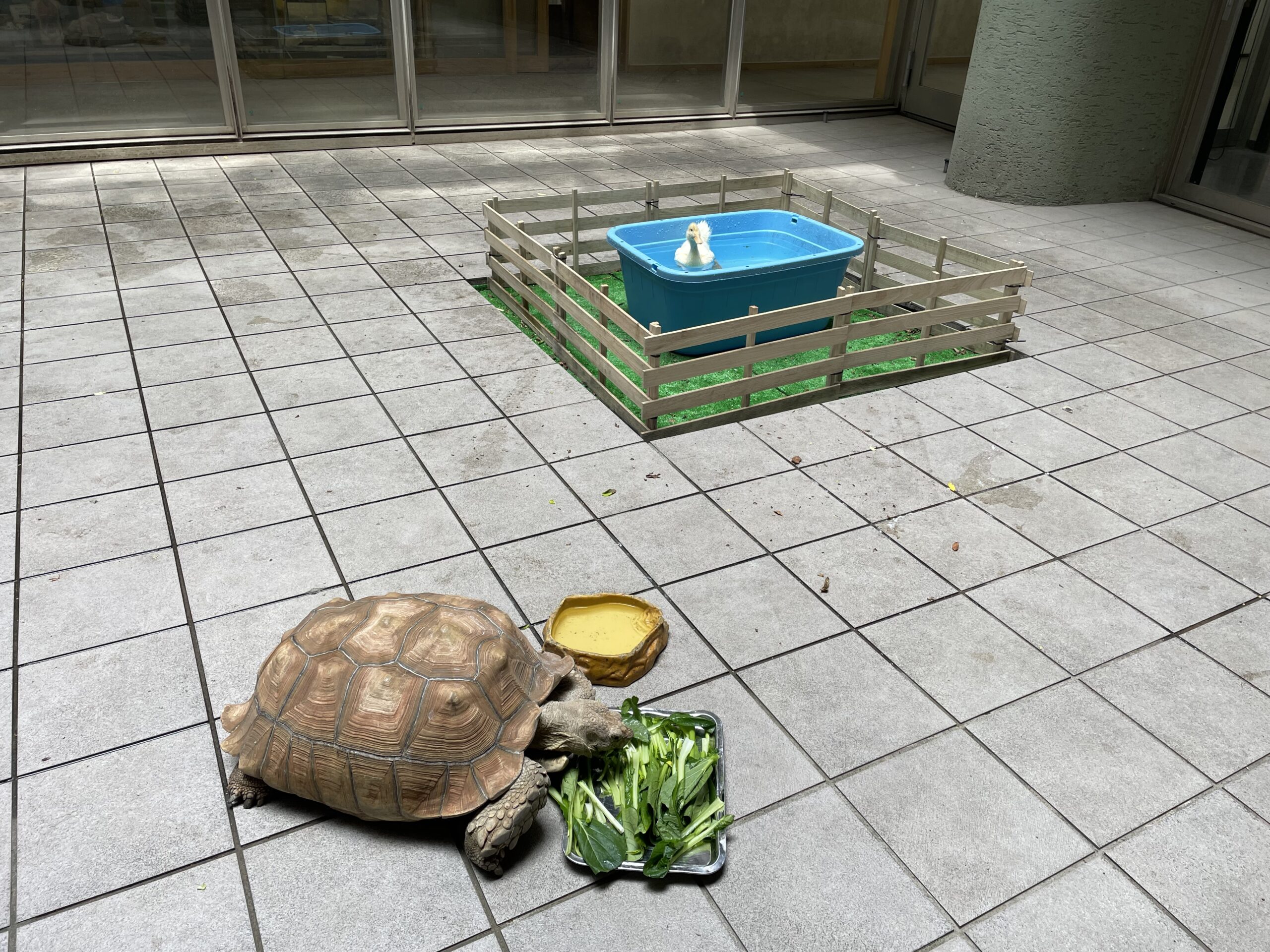 その頃中庭では、ケヅメリクガメのアクビが、お食事中。