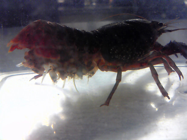 孵化(ふか)した赤ちゃんザリガニがたくさんついています。