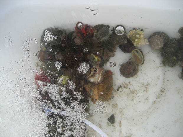 シッタカガイ、ヒザラガイなどの各種貝類、ヤドカリ、イソギンチャク、、ホヤ、ハゼ