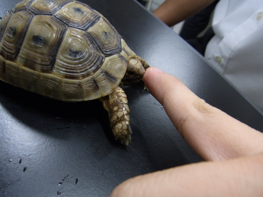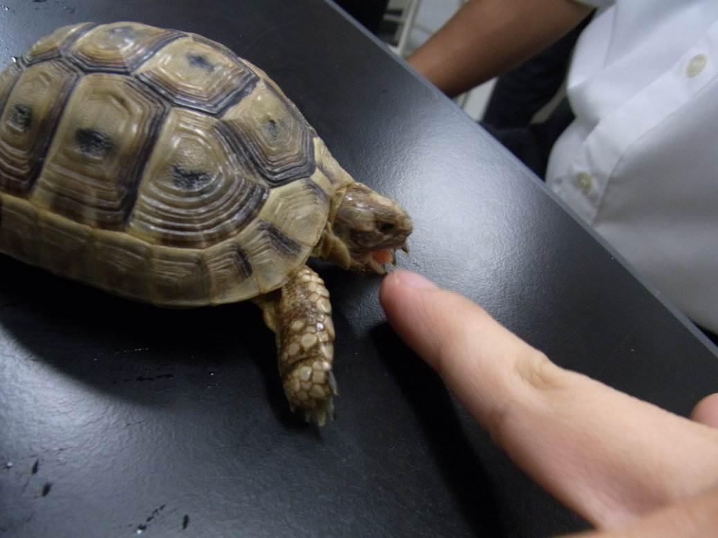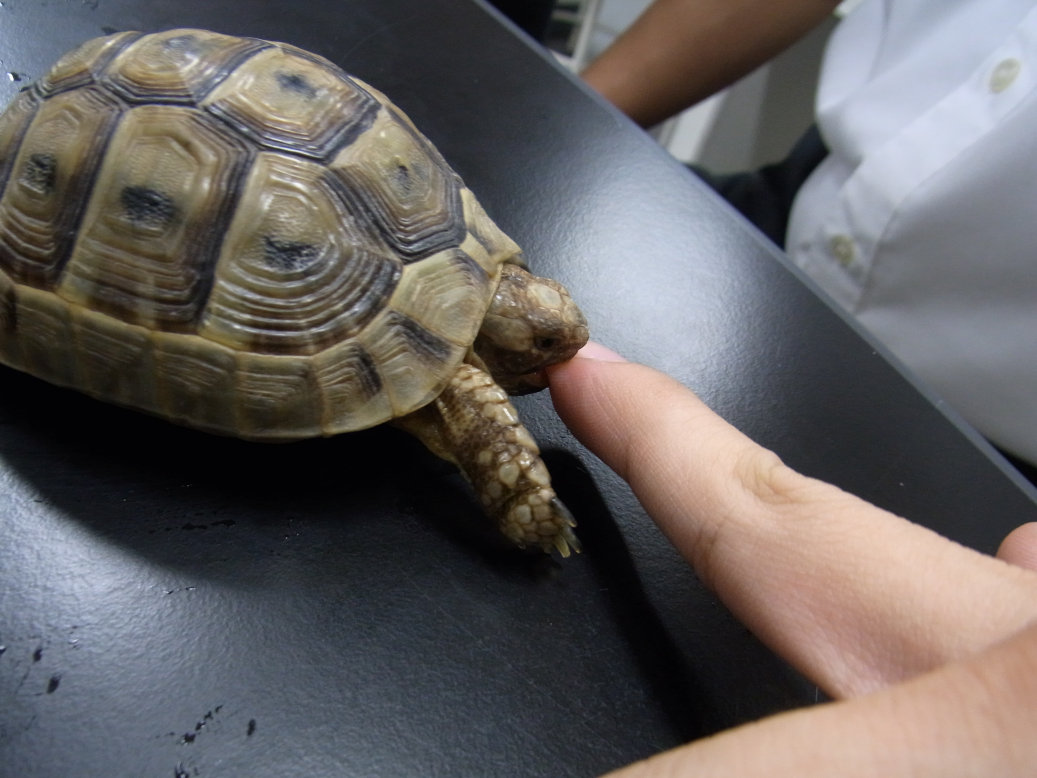ギリシャリクガメの頭をつつく部長