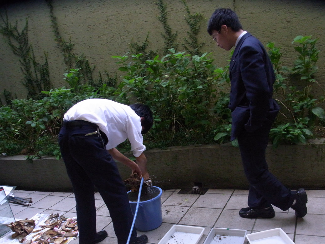 郁文館生物部恐竜班 が 怪しげな動物の骨 を発掘しました。 先ずは、ブラシと水で泥を落とす洗浄作業です。 見てないで手伝ってくれよ。 頭骨?