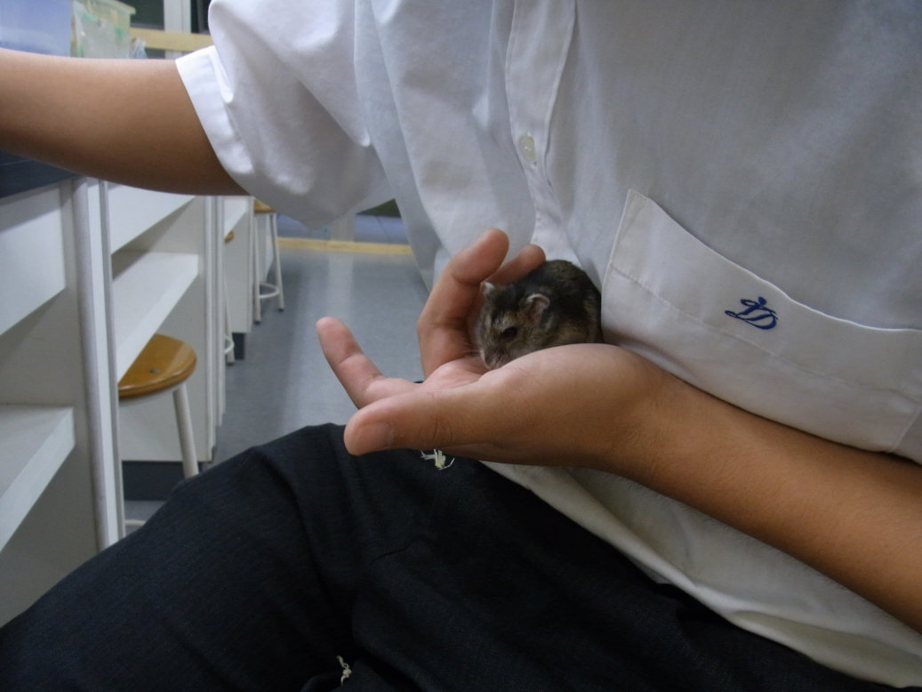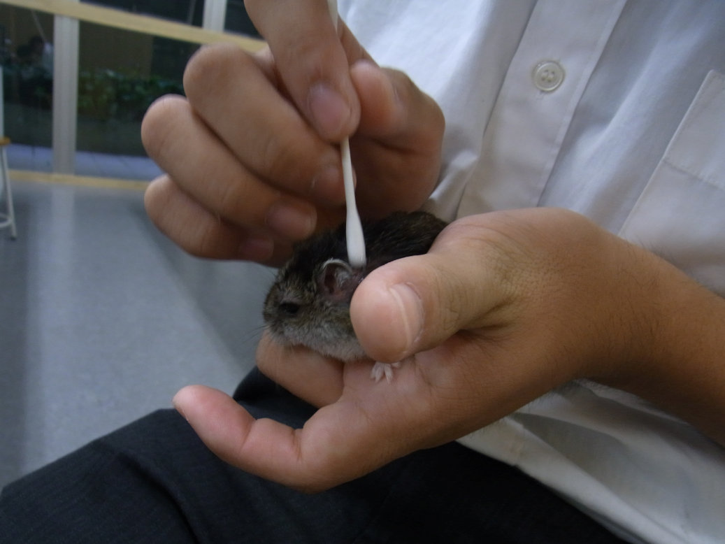 部員のお腹に抱えられたご存知ハムスター。 綿棒に消毒液をつけて患部に塗りつけます。 !? 痛っ! かわいそうですが、必要な治療なので我慢してもらうしかありません。