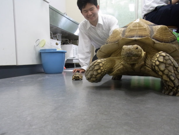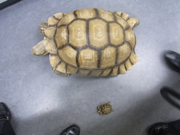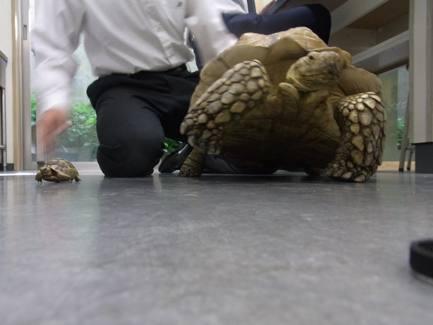 というのは冗談で、どちらも本物です。 下に写っていたのはblogでおなじみギリシャリクガメです。