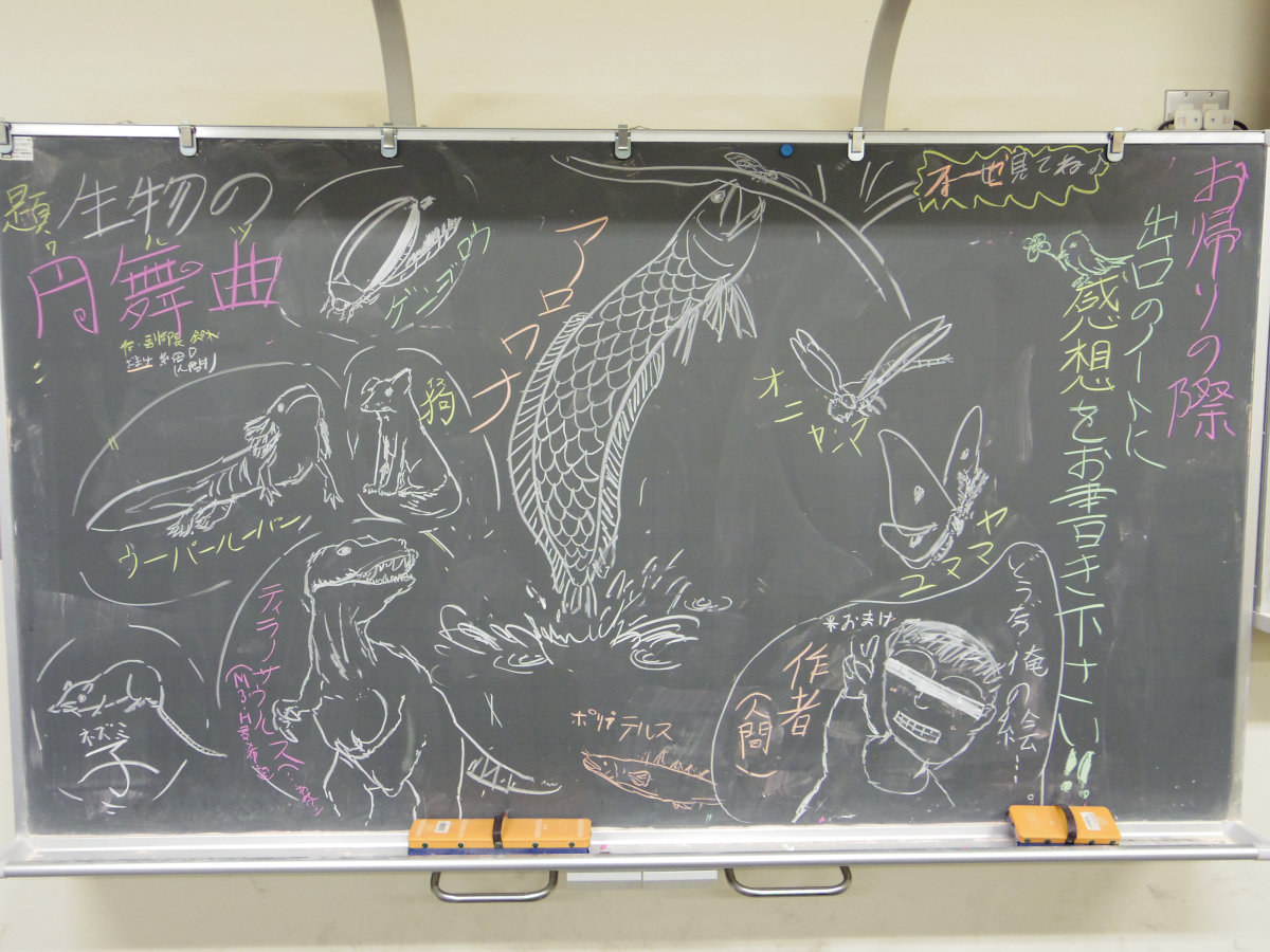 黒板が真っ白では寂しすぎるので生物部美術班が大活躍。
