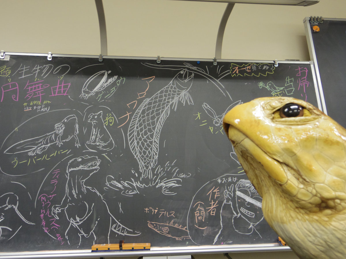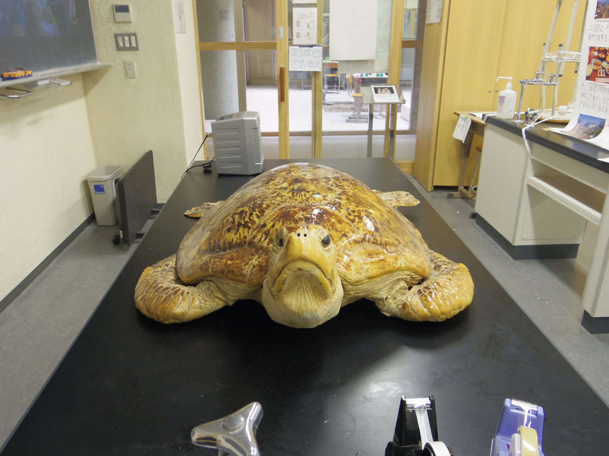 ウミガメの標本は教卓に。