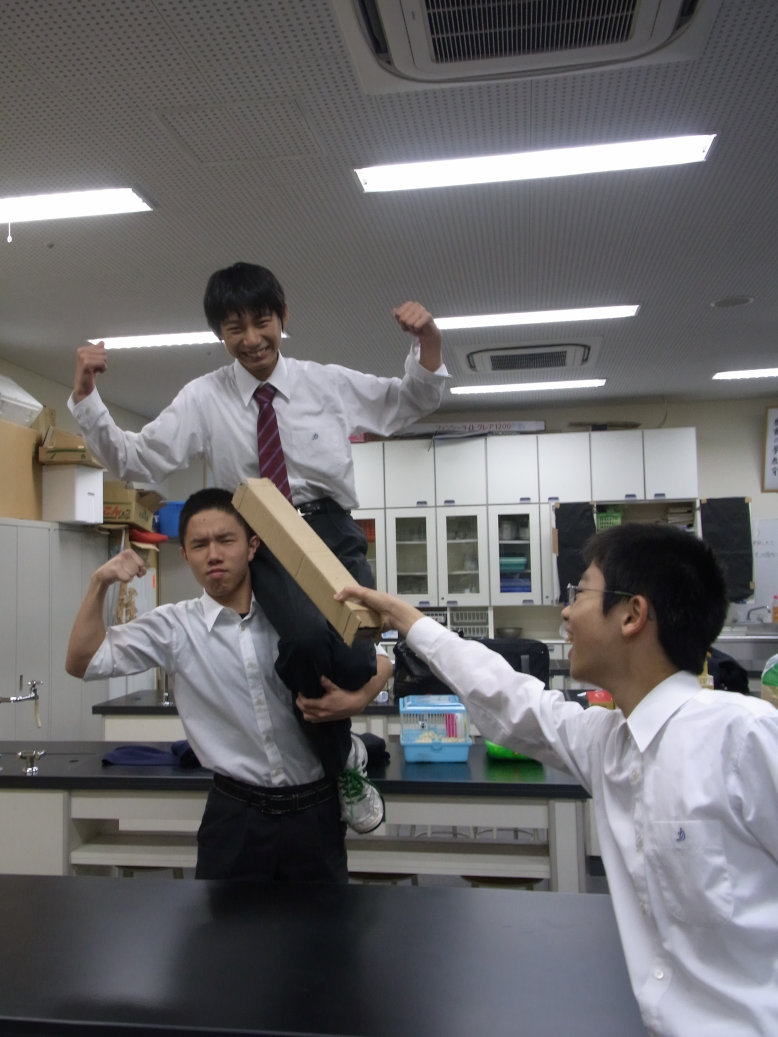 喜びのポーズをつくる2人( I 倉、K 藤 )とインタビューアー T 内