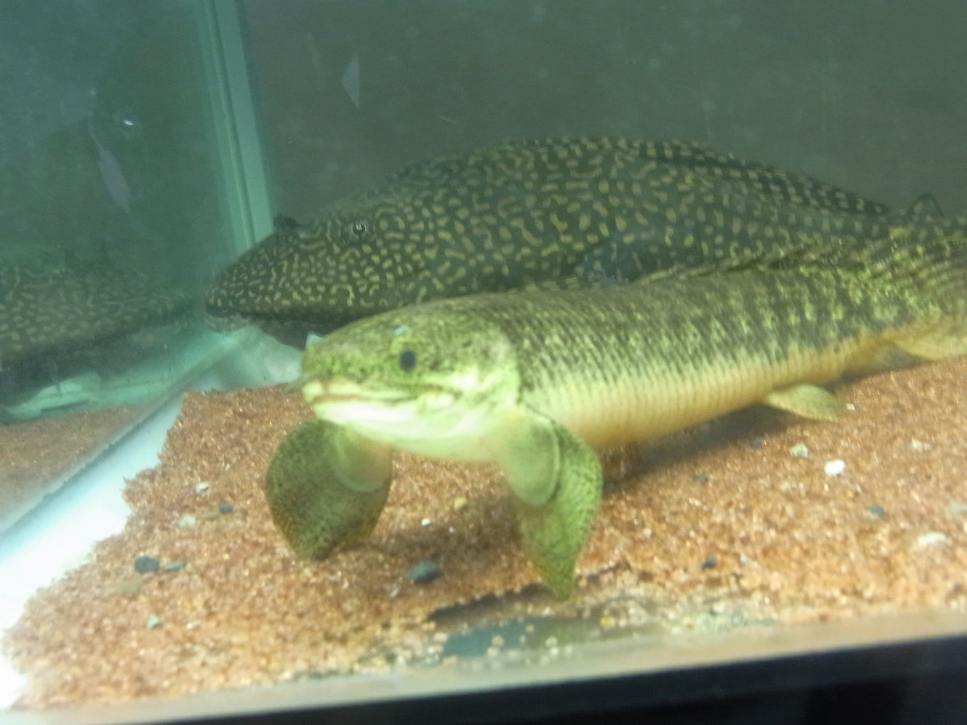 「もうすぐテストが終わるな」と部員を待つポリプテルス(手前)
