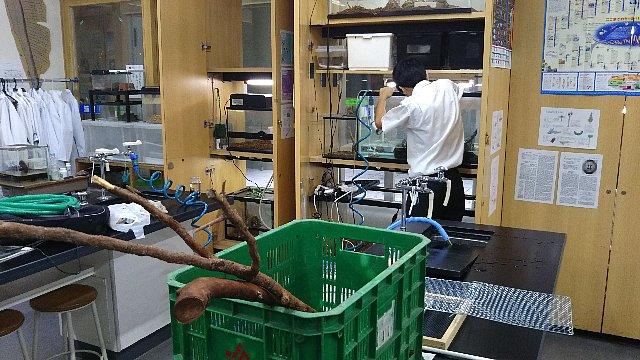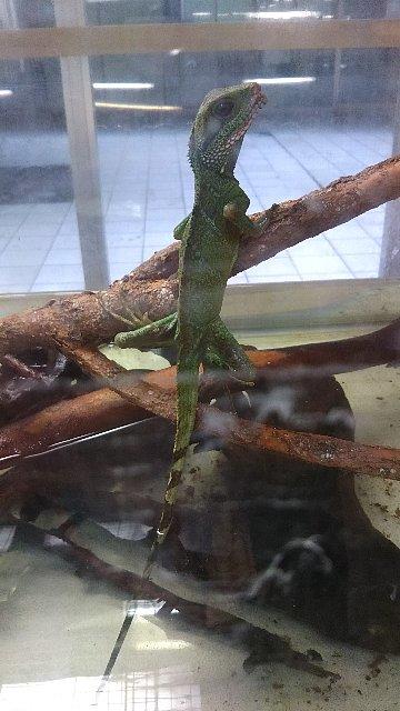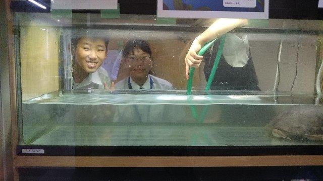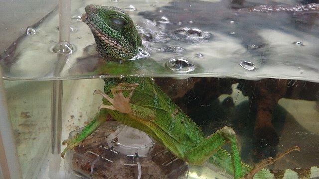 インドシナウォータードラゴンの水槽を見て悲鳴を上げている部員がいました。