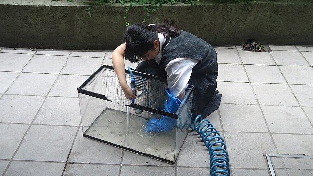 ケージや水槽の掃除をしたり、エサをあげたり、、、、、、。
