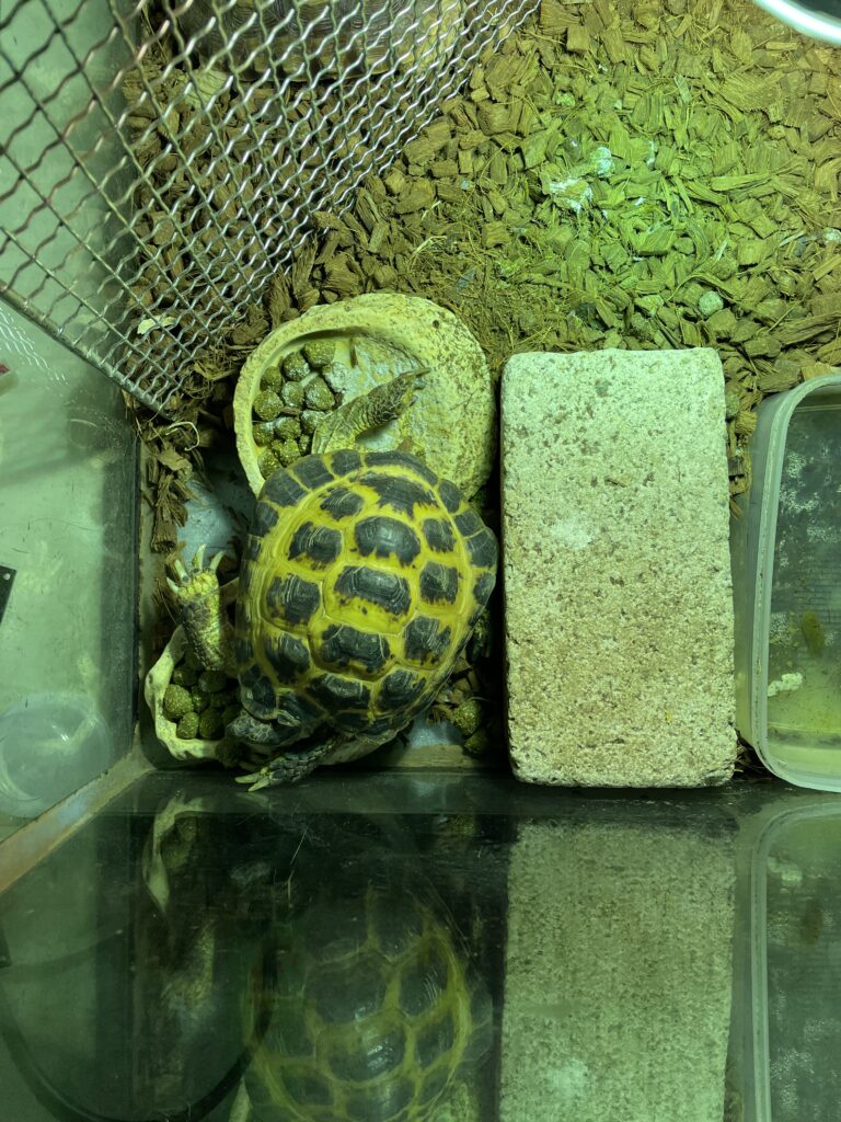 世話をしてもらって、エサの上で眠るロシアリクガメ。