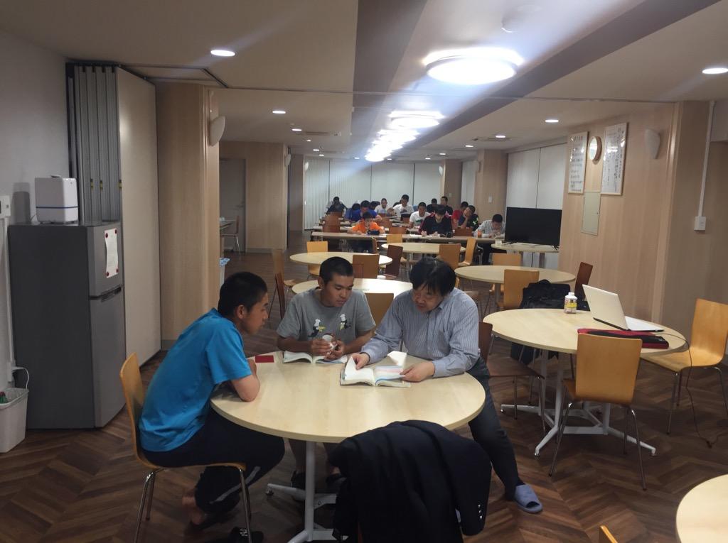 現在は前方の円卓で食事をし、後方の長机で勉強を行っております。