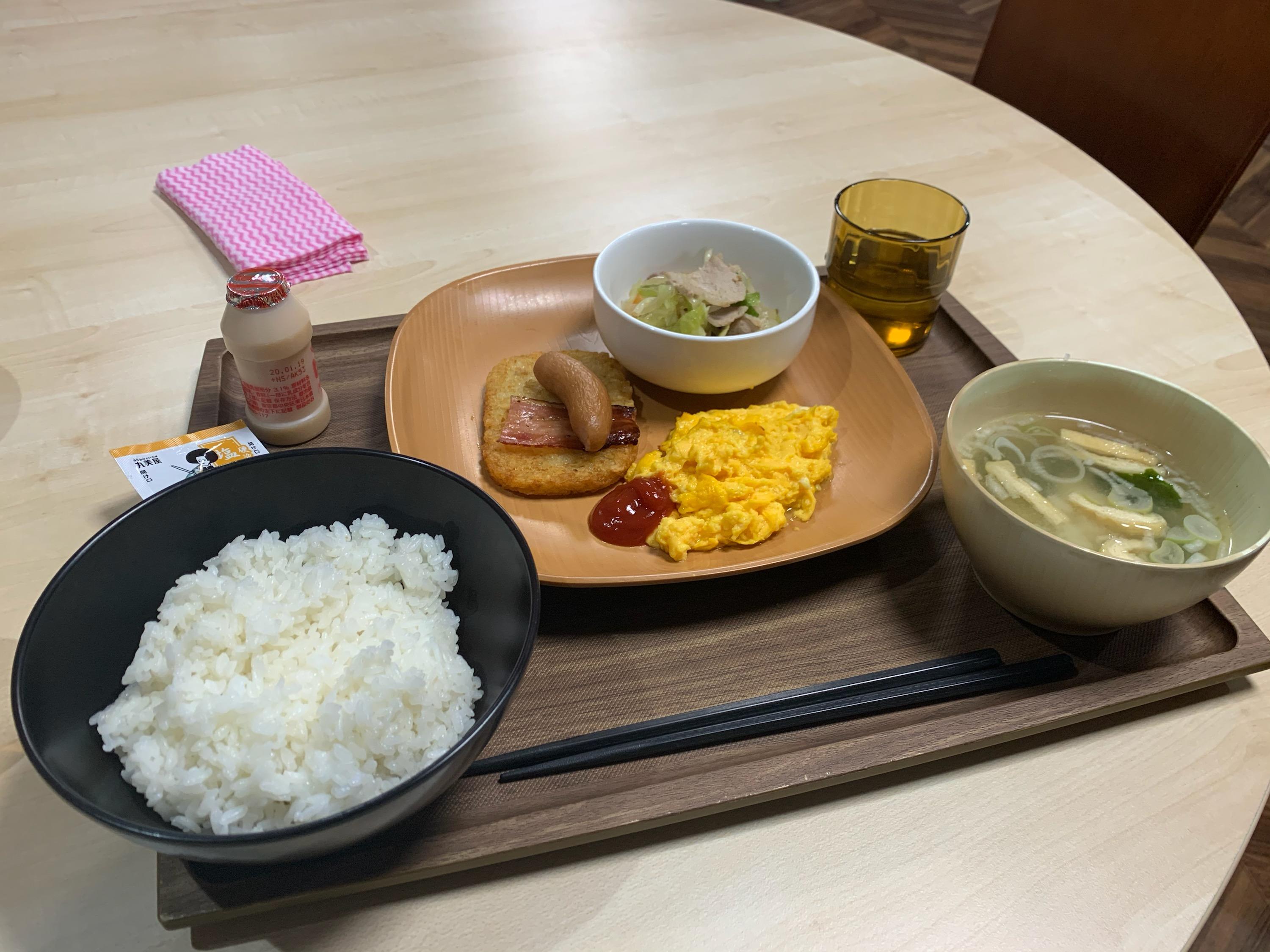 〈1月12日の朝食(スクランブルエッグ定食)〉 〈寮生の食事の様子〉