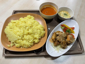 夕食(ターメリックライス、タンドリーチキン、カラフル温野菜、トマトスープ)