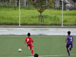 13分、相手陣地でフォワードがボールをキープ、左サイドからドリブルで上がり、大きく前に出したボールに自分で追いつき、キーパーが飛び出していないゴール前へ。