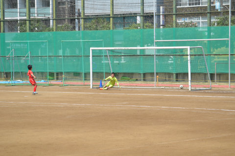 郁文中2番手は、センターバックの選手。キーパーの動きを見て、自分の間をとって…キーパーのからだと逆方向にシュート。成功。