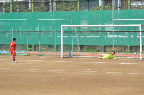 1番手は、ボランチの選手。蹴るタイミングが合わなかったのか、ボールに威力がなく、相手キーパーにセーブされる。