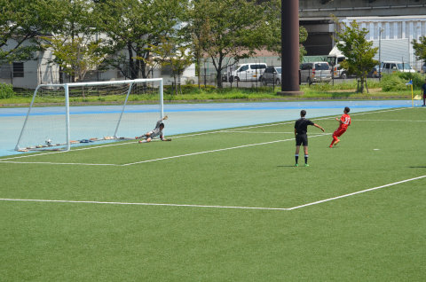 前半開始1分、相手のディフェンダーがミッドフィルターにロングパス。そのボールを郁文館のフォワードの選手がすばやく奪い左サイドから地を這うミドルシュート。見事にゴール右隅に決まって先制します。