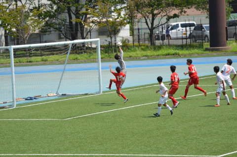 後半12分、今度は右コーナーキックのチャンスです。今度こそものにしたいセットプレーです。キッカーのボールは緩やかなカーブがかかり、距離感も十分でした。しかし惜しくもゴールポストの上に当たってしまいます。落ちたボールをキーパーがグローブでクリア、惜しい!と思った瞬間、必死に足を伸ばしてクリアボールに触った郁文館の選手。そこから跳ね返ったボールが相手選手の手に。ハンド、PKです。これを決めて追加点をとりました。