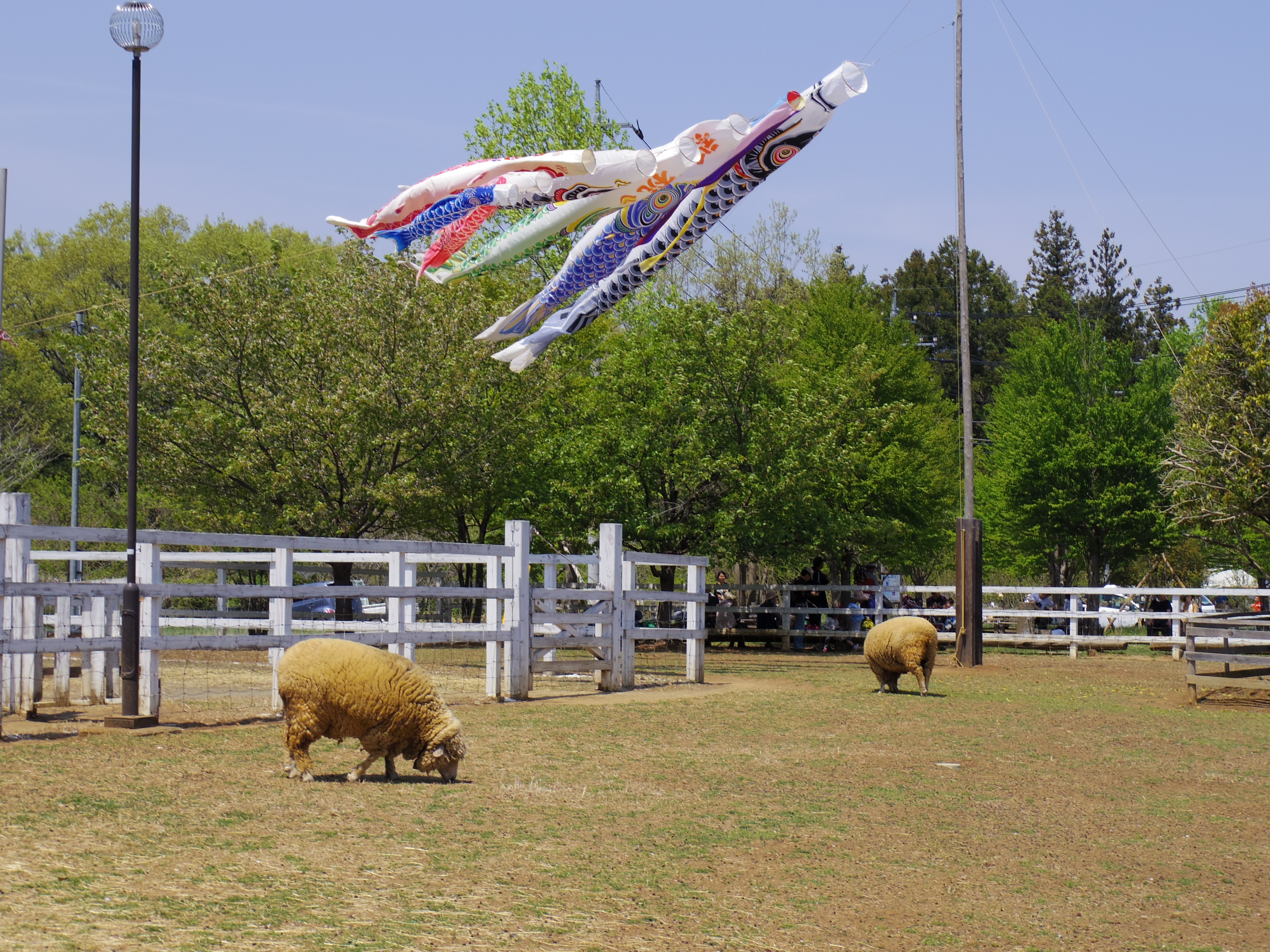 羊山公園なので文字通り羊もいます。鯉のぼりも風に舞い、春の爽やかな空気を演出していました。