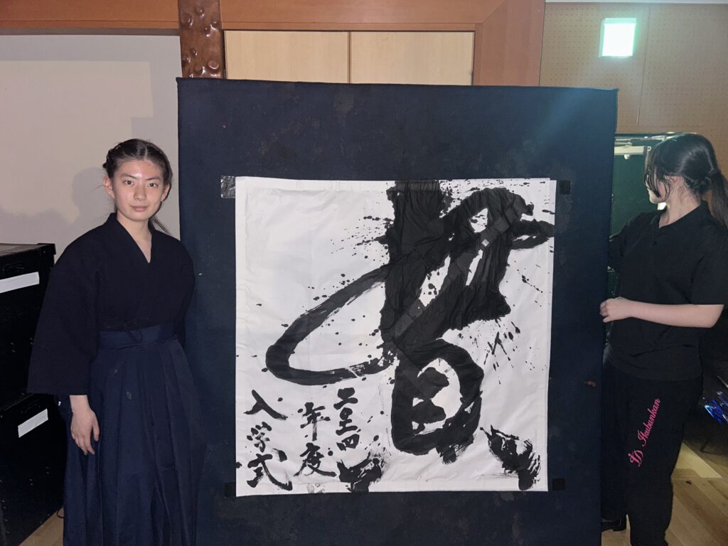 毎年、理事長から新入生の皆さんへ送られる漢字一文字を書道部部長の市川 芳絵が揮毫しました。