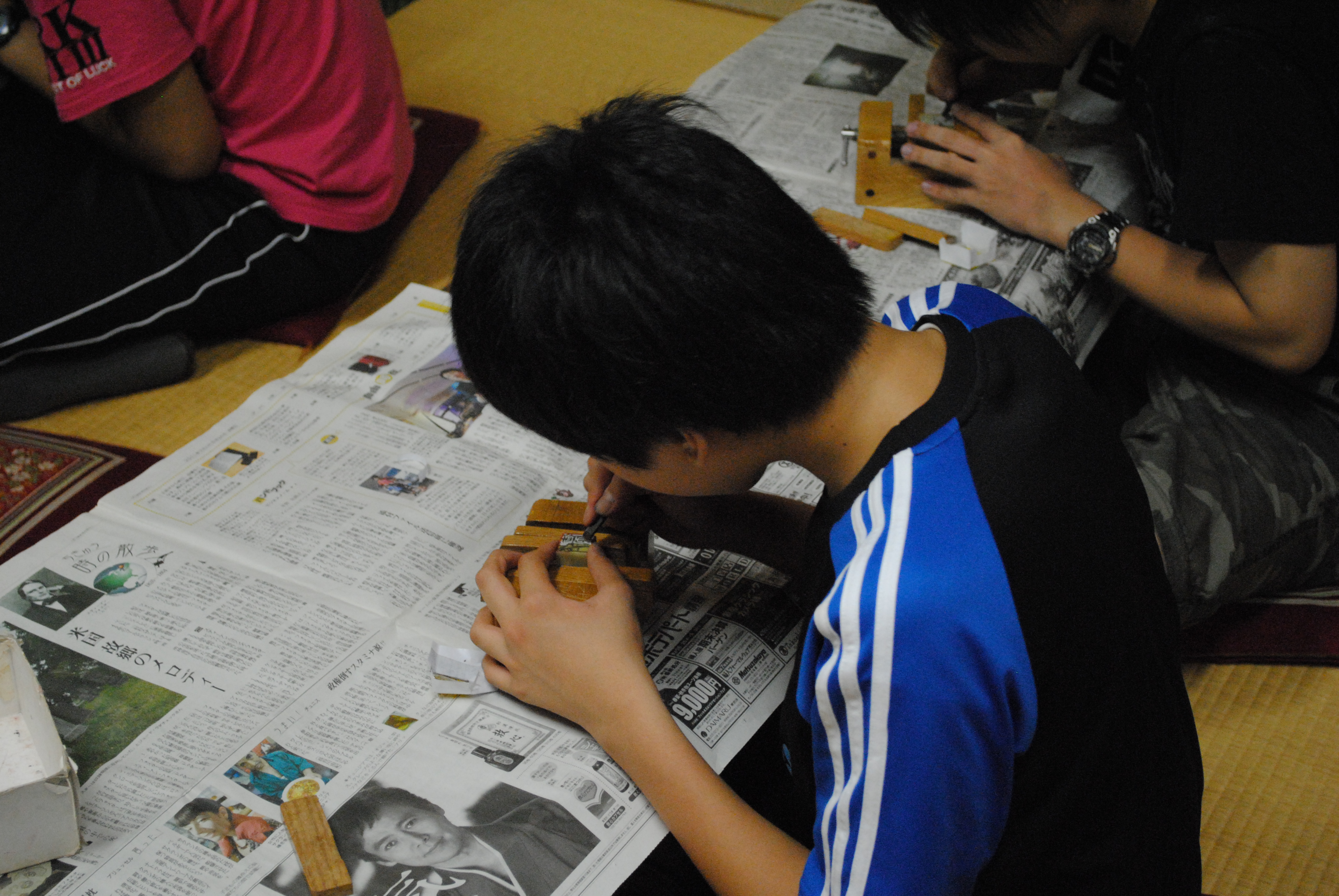 2日目は、自分の作品に押す印を制作しました。初めて掘る中学1年生も居り、少々心配でしたが、なかなか上手く出来ていたようです。失敗しないよう一生懸命掘りました。