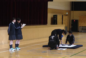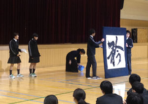 新入学生対象クラブ紹介にて、高校3年副部長の草川が、席上揮毫を行いました。これは今年度の入学式で書いた今年の一文字「矜」です。今の書道部の活躍と今後の意気込みを含め行ったパフォーマンスですが、新入生に伝わったかな?