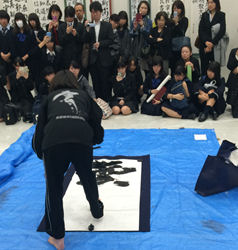 平成27年11月18日(水)~22日(日)まで、東京都豊島区芸術劇場にて、第28回東京都高等学校文化連盟書道展が行われました。今年もギャラリーには高校生達の渾身の作品が余す所なく展示され、来場者の方々の目を大いに楽しませてくれました。そんな中、書道部高校2年浦奈々瀬が東京都教育委員会賞を受賞し、東京都から7名しか入れない枠に今年も入ることができました。これで5年連続8回目です。当日は賞状の授与とみんなの前での席上揮毫を披露し、会場を沸かせました。