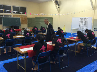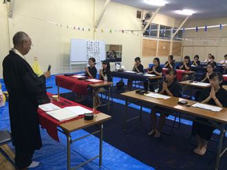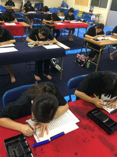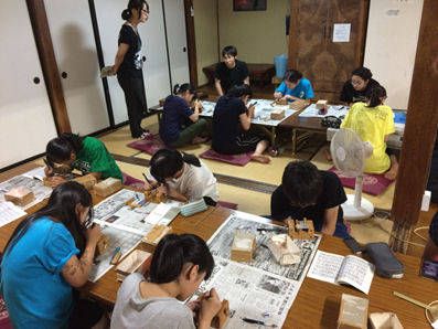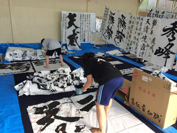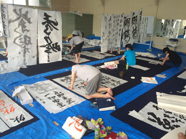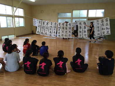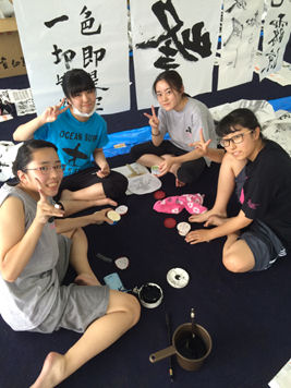 芸術の秋というように、秋には展覧会や文化祭があります。書道部は毎年数々の展覧会に出品しますが、この夏合宿で各展覧会に向けての作品作りの特訓をします。朝は8時から夜は10時まで書きっぱなしです。1年間で一番実力がつくときです。そして今回は地元のお寺から住職を招いて、写経指導も受けました。