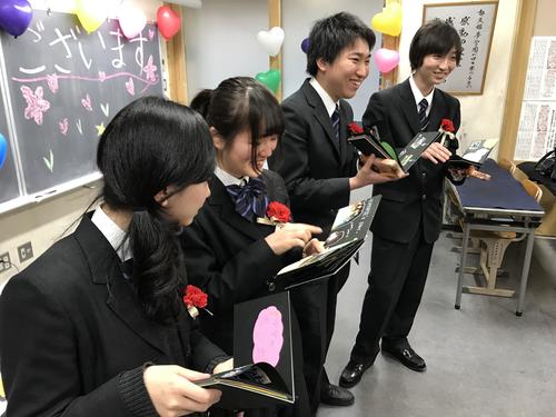 卒業式後に書道室に集まってもらい、後輩部員からの挨拶やプレゼントを渡し、長きに渡る部活への慰労をしました。