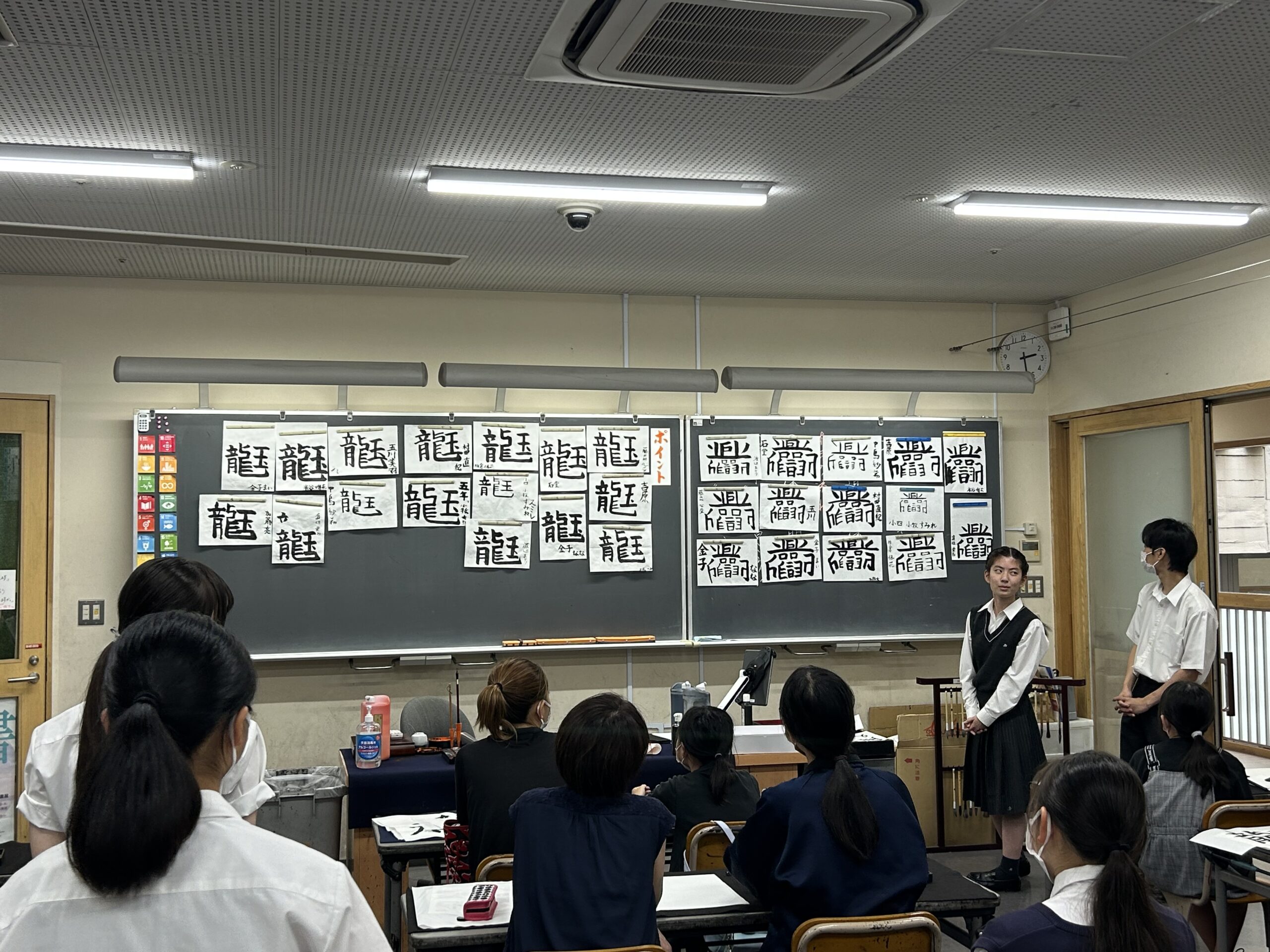第2部では、部員にバトンタッチして、ちょっと面白い難読漢字を筆で書くというレクリエーション的な作品制作を行った。