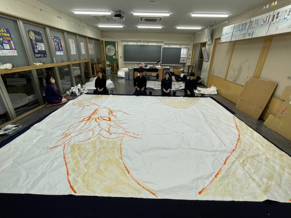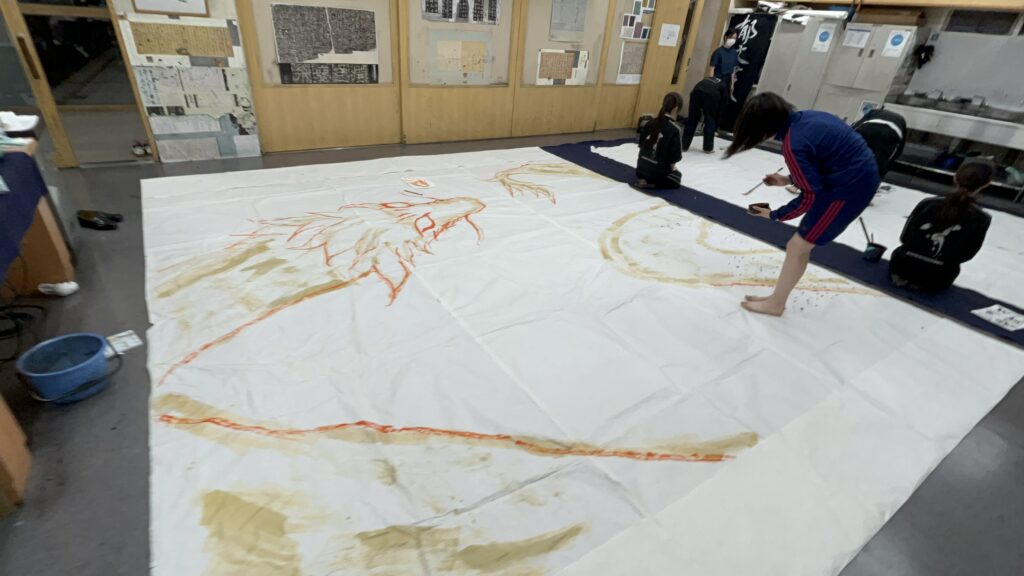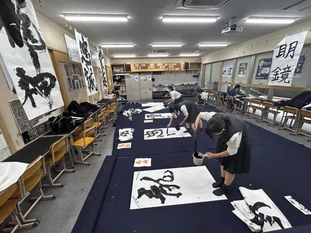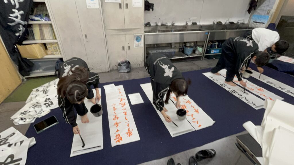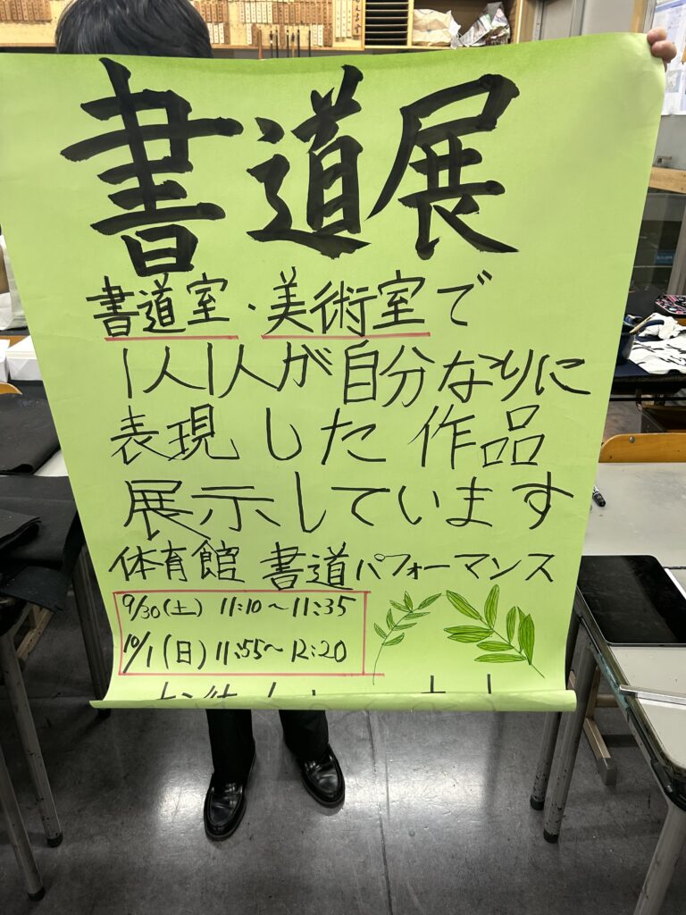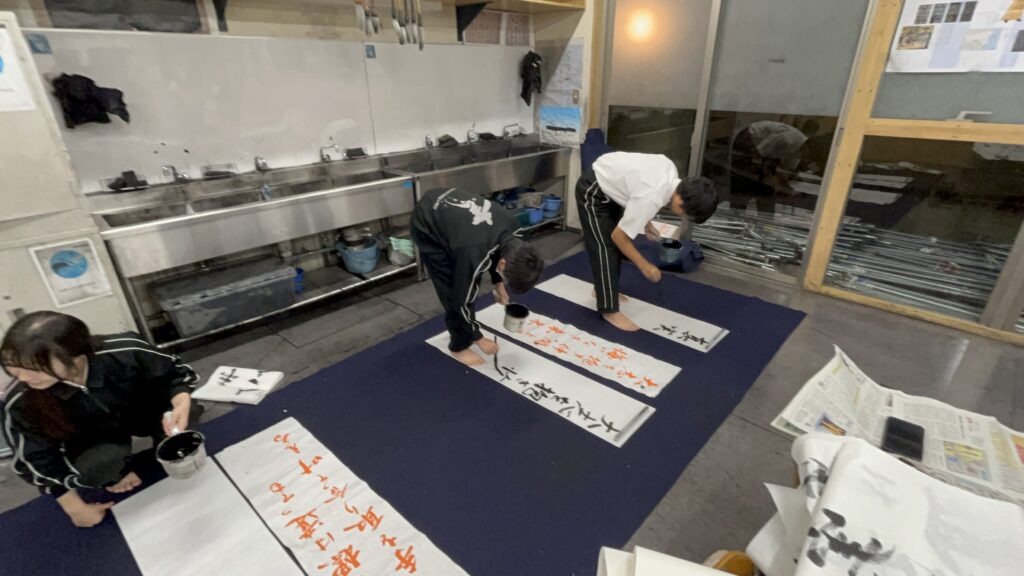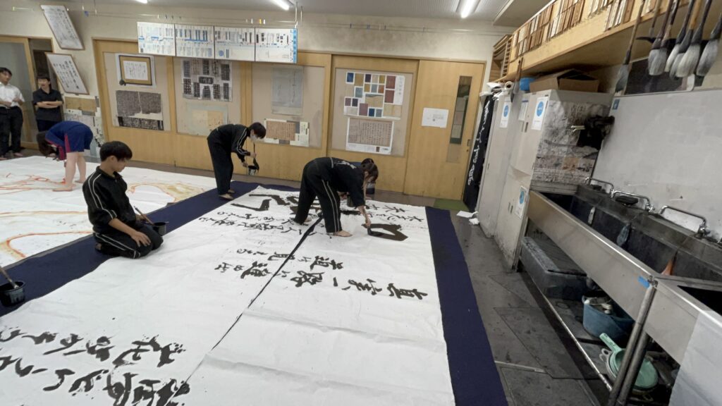 地下体育館のステージで披露する書道パフォーマンスの練習の風景や展示に向けた準備の様子をちょっとばかりですがご覧下さい。