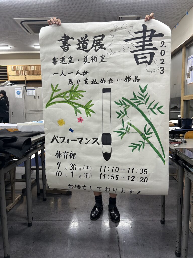 地下体育館のステージで披露する書道パフォーマンスの練習の風景や展示に向けた準備の様子をちょっとばかりですがご覧下さい。