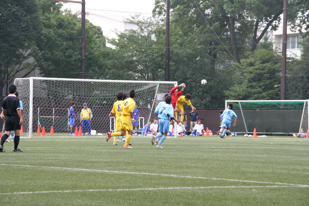 郁文館DFがゴール前で懸命のクリアを続ける。