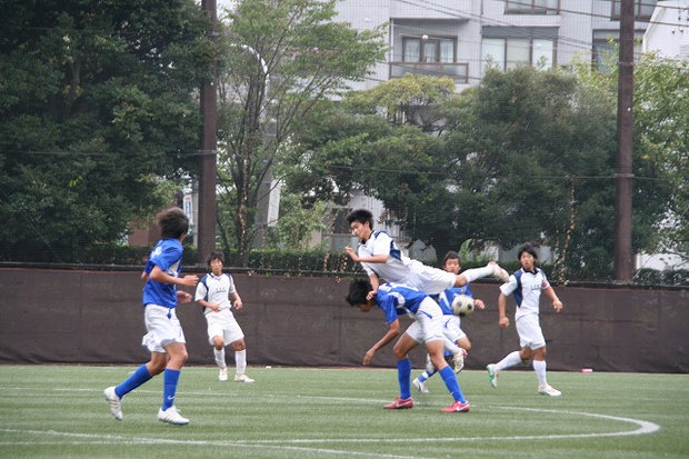 相手の長身FW(193cm)を基点に攻める学習院に、センターバックの空中戦での競り合いが多くなる