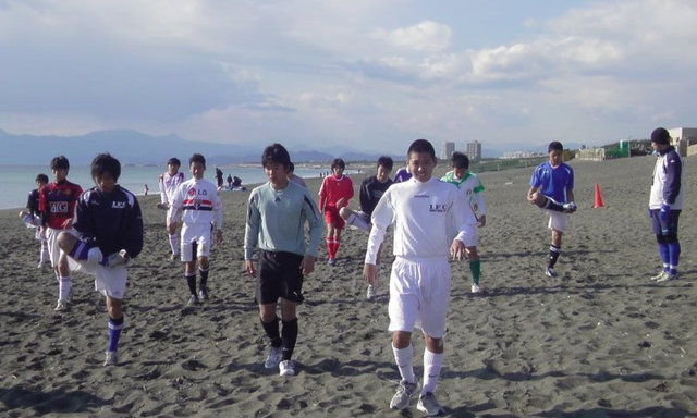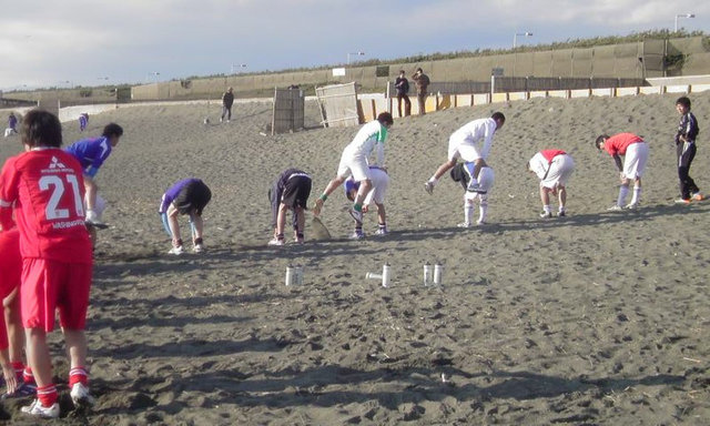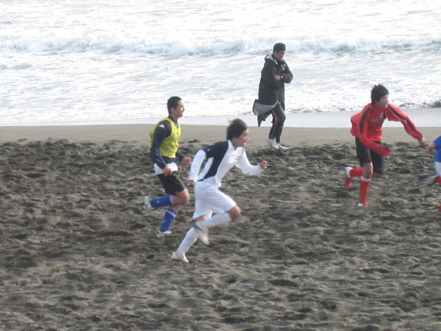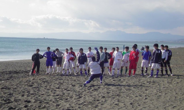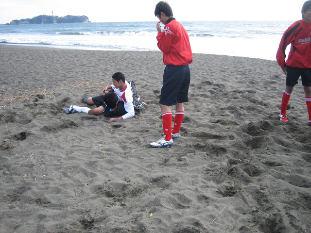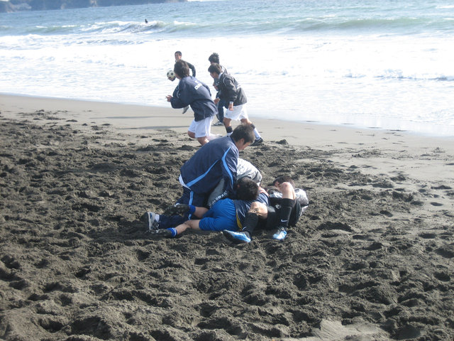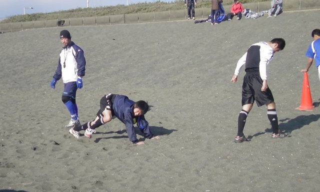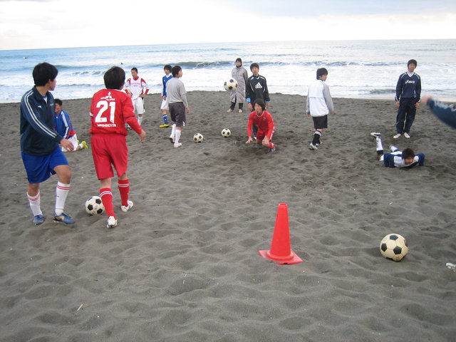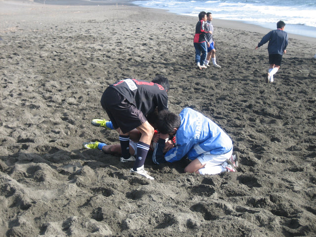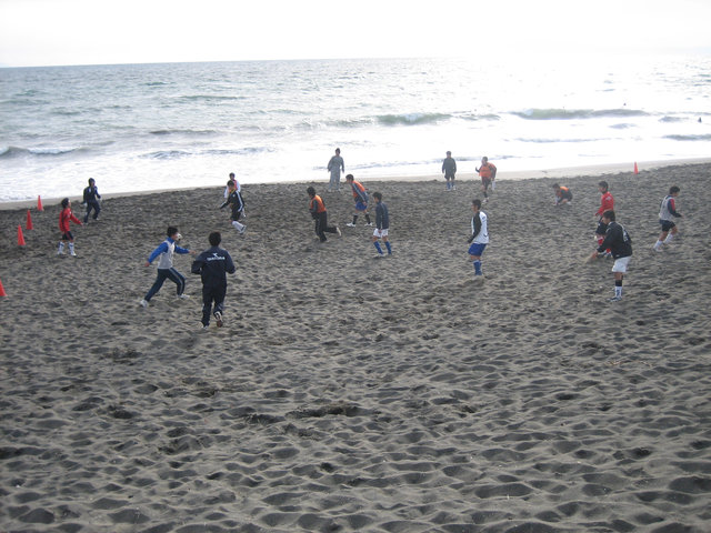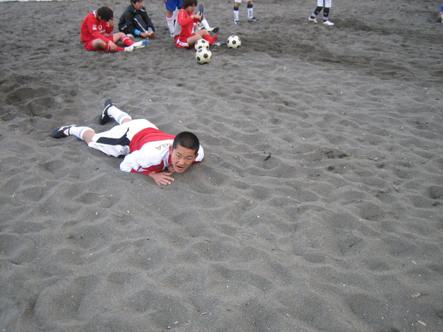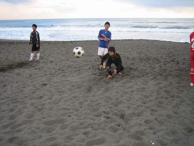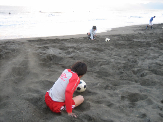 波打ち際でのスライディング練習。ボールを海に入れないように必死にボールを掻き出していました。